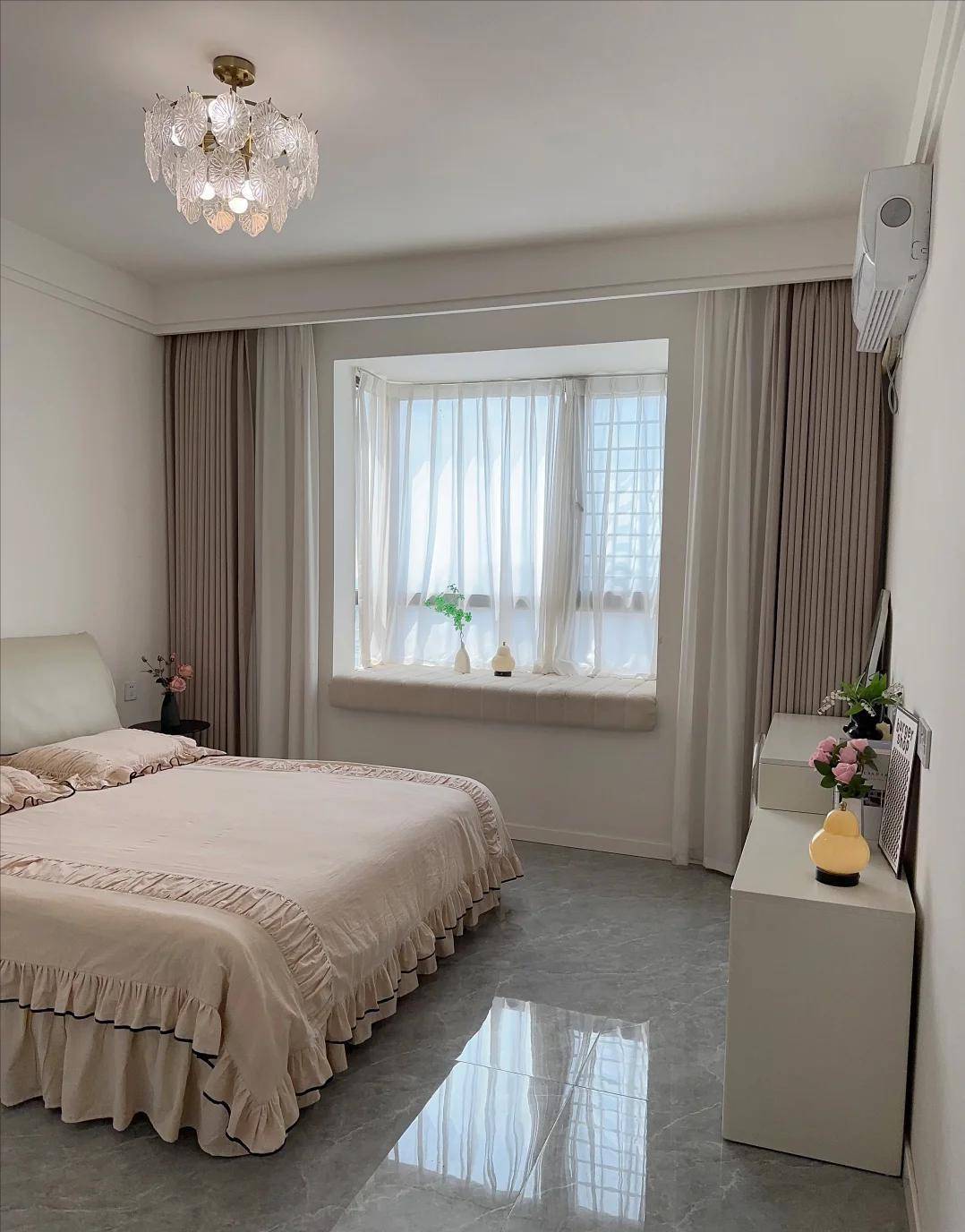 她特意在床边放了个小书架,堆着几本书和香薰蜡烛。床头灯是暖光的鹅蛋形台灯,不刺眼,却让空间充满安全感。那种“干净但不冷”的氛围,正好契合她的性格——安静、细腻、有生活气息。