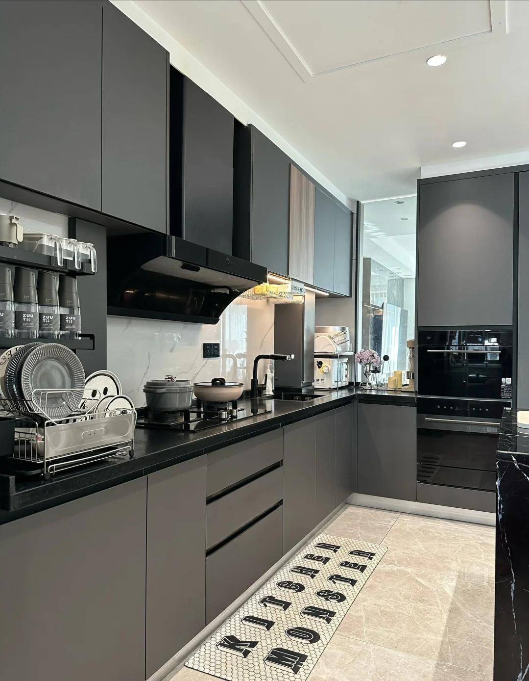 秦岚家的厨房不算大,但布置得异常讲究。是那种一看就知道主人常下厨的厨房。她选的是L型布局,橱柜是浅灰色岩板材质,台面整洁到几乎看不见杂物。冰箱、烤箱、洗碗机都嵌入在墙体中,完全看不出电器线头,一体化的设计显得格外高级。