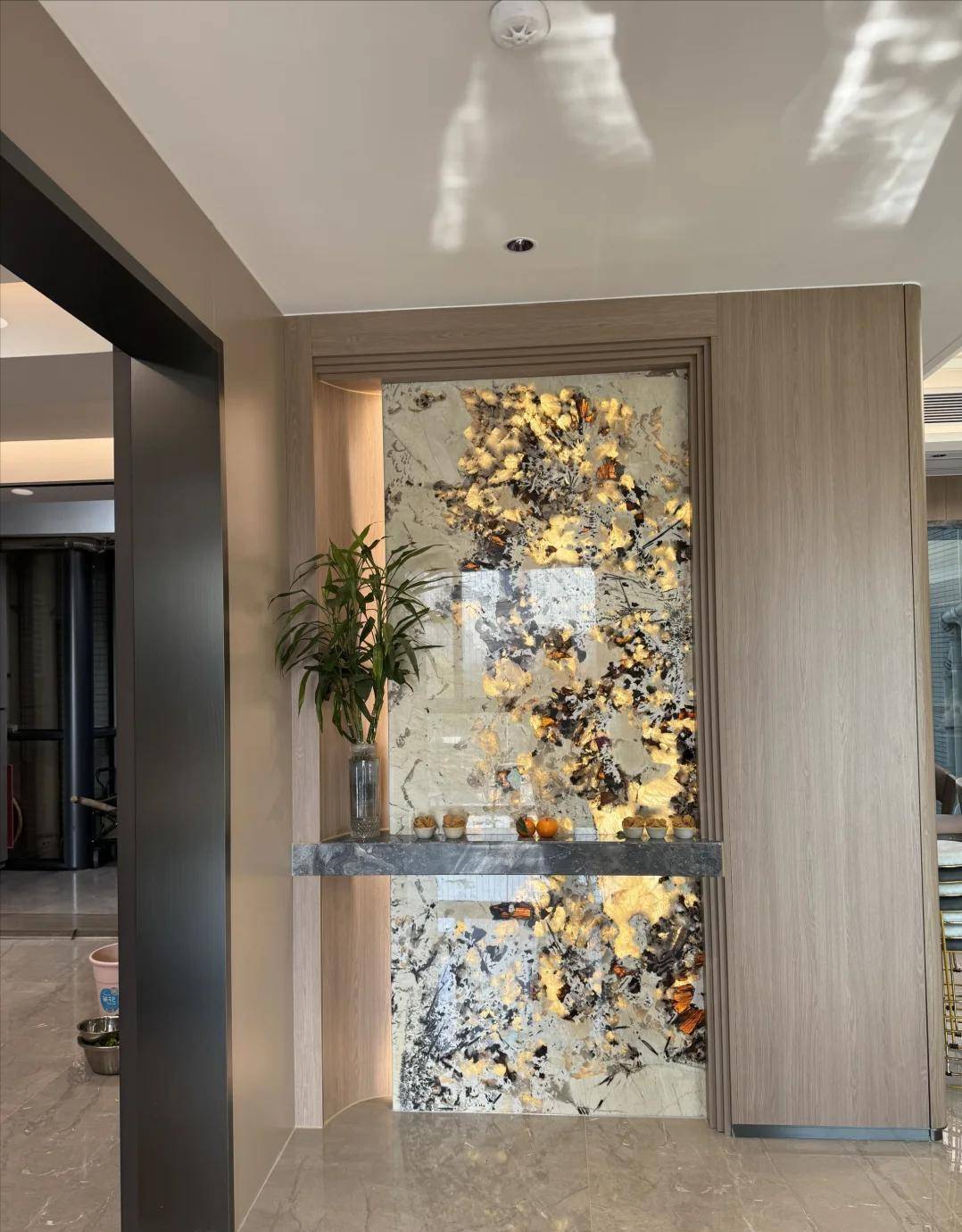 秦岚家的玄关不大,但细节拿捏得极好。鞋柜做了嵌入式设计,白色柜门配上浅金色拉手,干净又高级。旁边还留了一块换鞋区,放着一张木质长凳和几盆绿植,看似随意,却非常生活化。光线透过玄关灯柔和地洒下来,让人一进门就能感受到那种“回家的安稳感”。