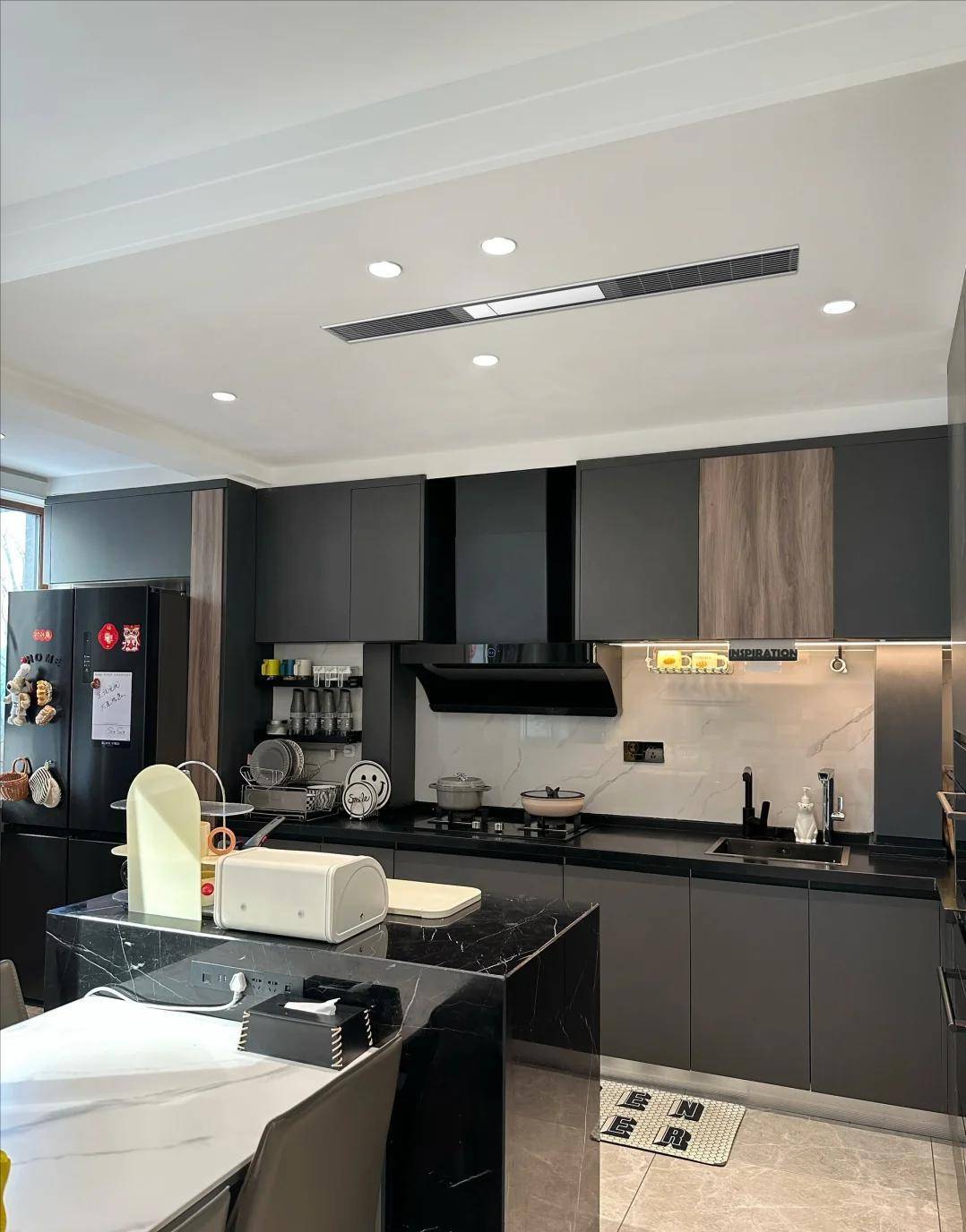 最让人佩服的是她对“干净”的执着。油烟机是顶吸式的,灶台边一点油渍都看不到,墙面贴着防油防水的浅色瓷砖,光亮得能反光。网友调侃:“秦岚家的厨房,干净得让人舍不得炒菜。”