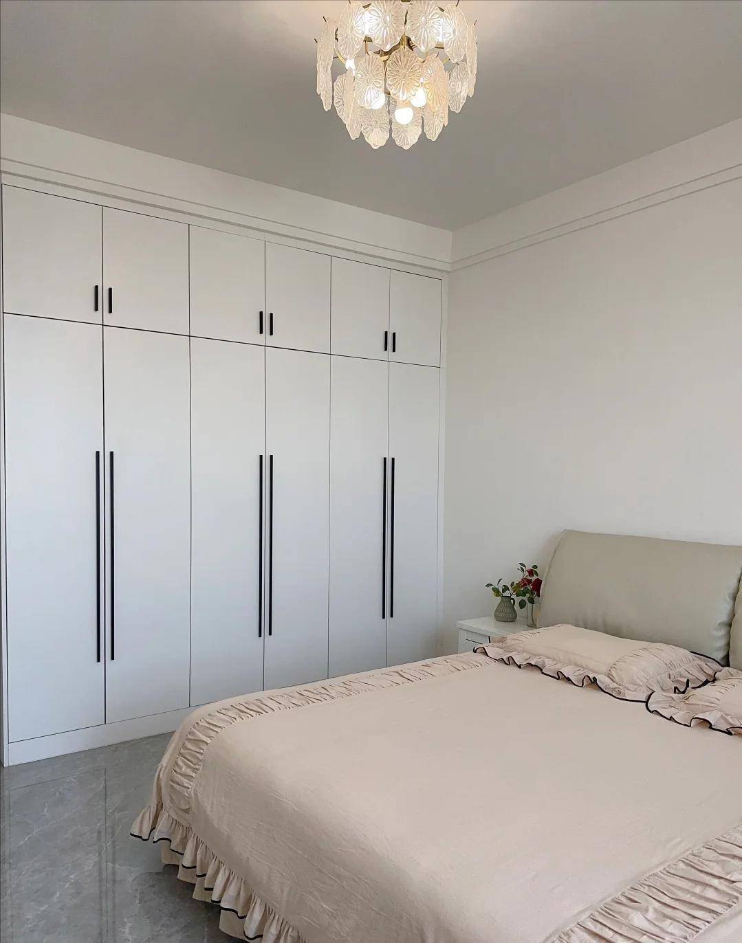 秦岚家的卧室,是那种一眼就让人想钻进被窝的空间。墙面用了米白色乳胶漆,没有花哨装饰,床头是布艺软包,温柔又静谧。床上用品选的都是浅灰、米色系,窗帘厚实又遮光,阳光洒进来时,整间房柔得像滤镜。